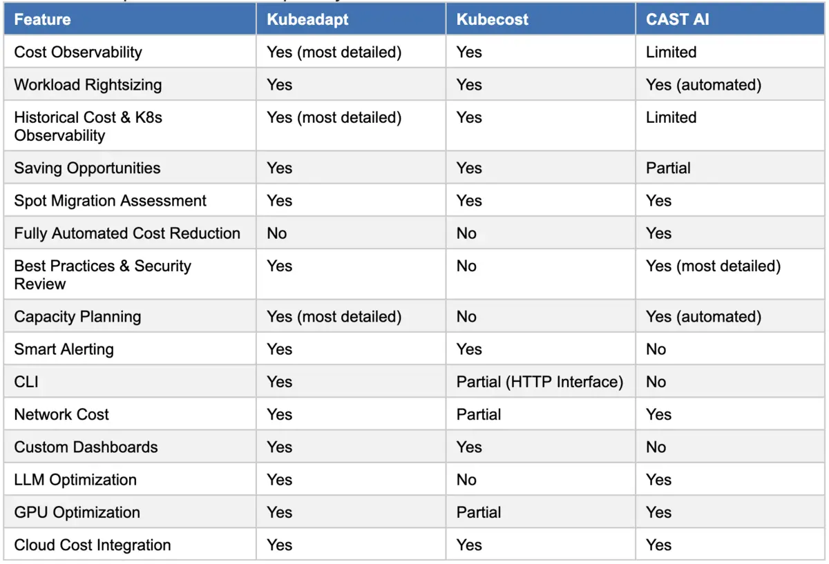 When evaluating Kubernetes cost optimization tools, CAST AI and Kubecost are often part of the conversation. Each is a capable platform, but their underlying approaches reflect fundamentally different philosophies. For transparency, here is a comparison of key features across Kubeadapt and these solutions: